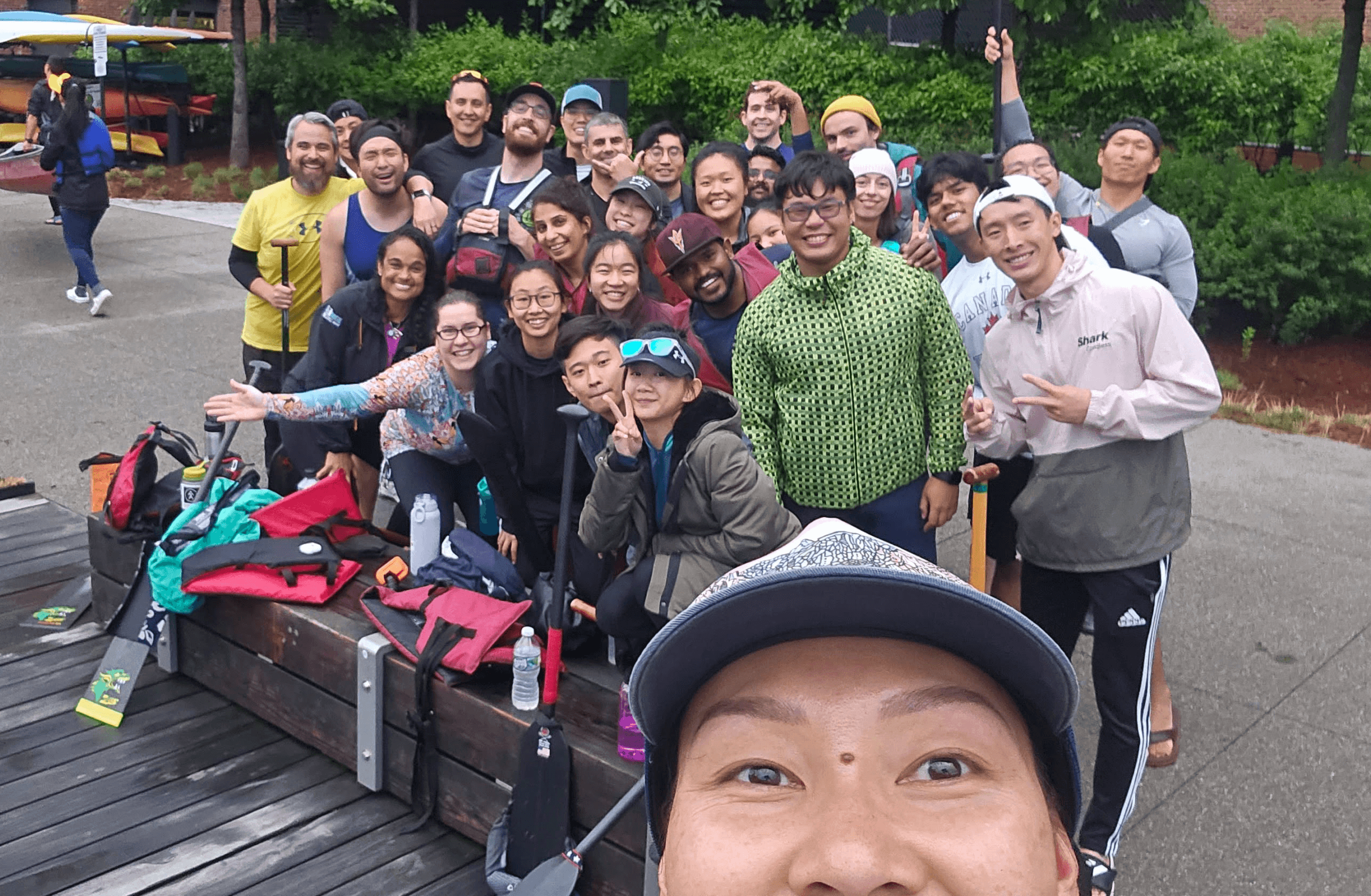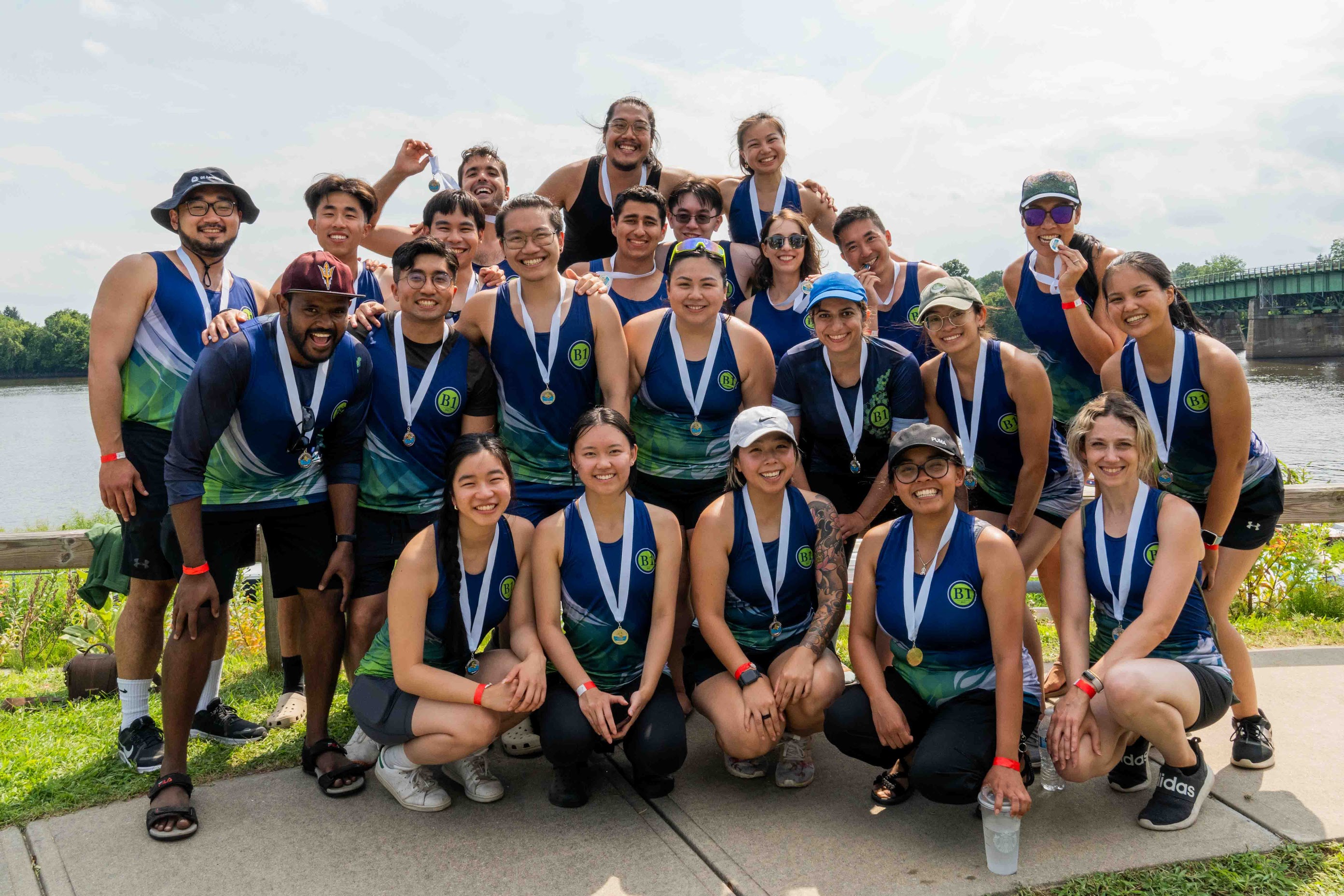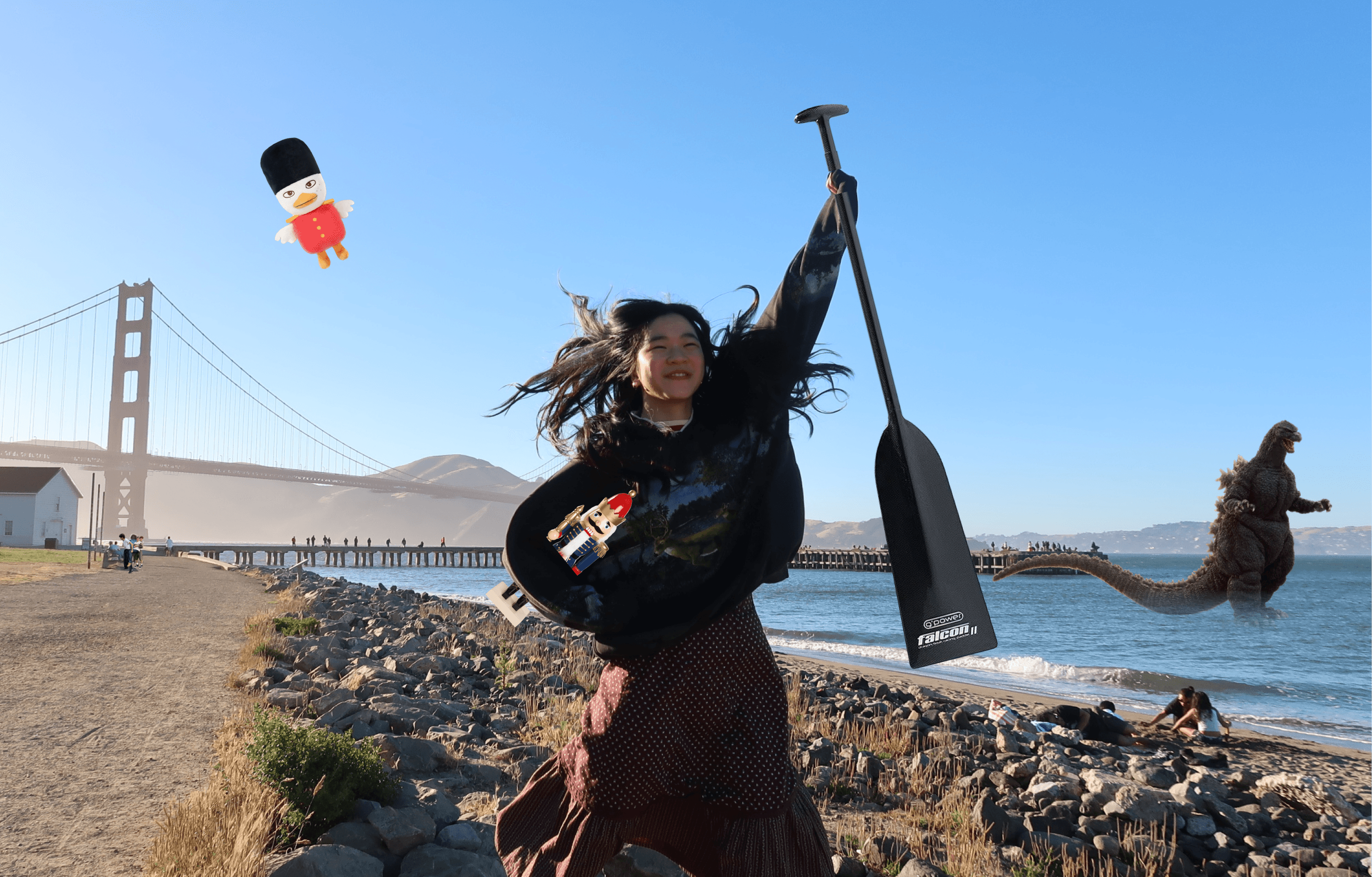 Pictured: Jyaleen Wu holding a nutcracker and dragon boat paddle. Ddolbyeong flies above her right shoulder. In the background we see Godzilla wading in the San Francisco Bay.